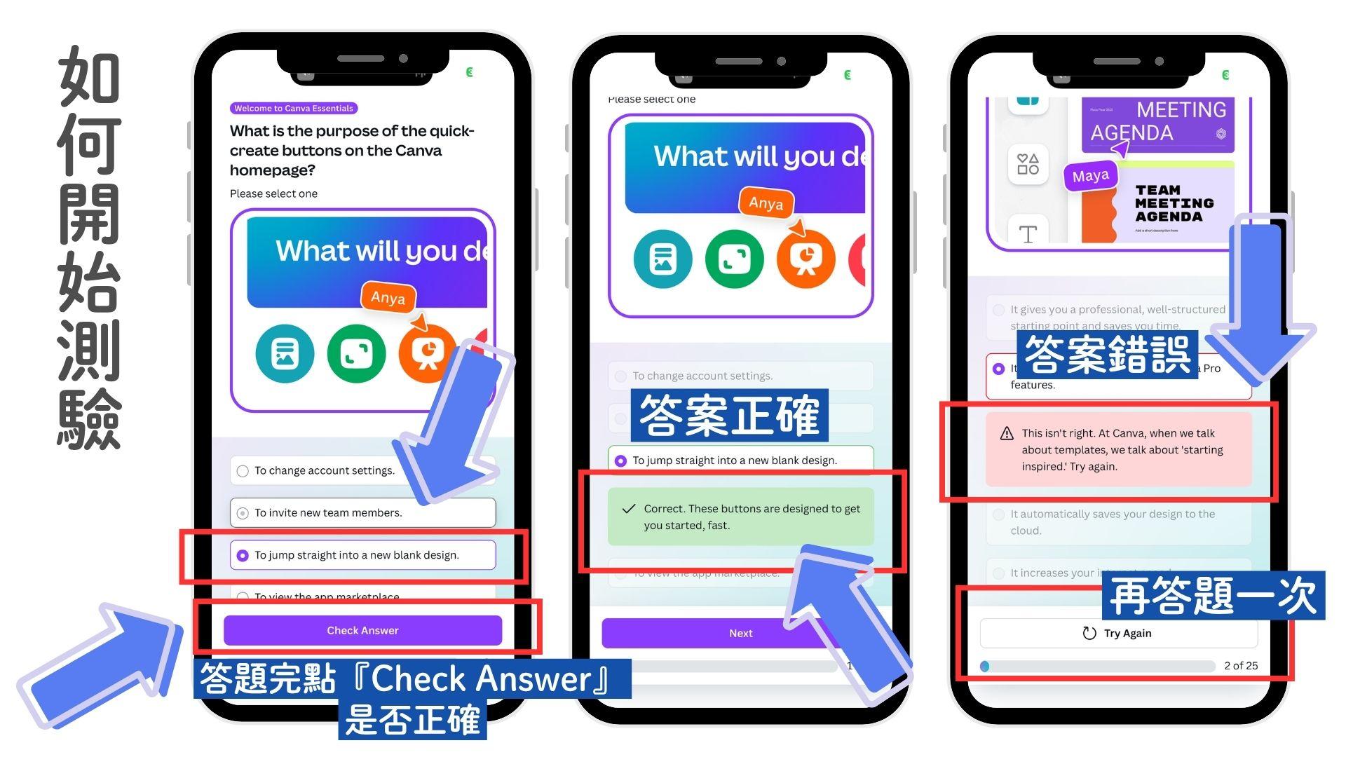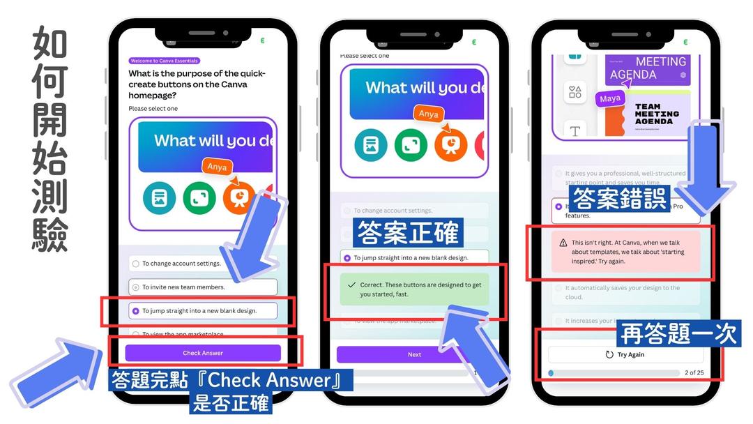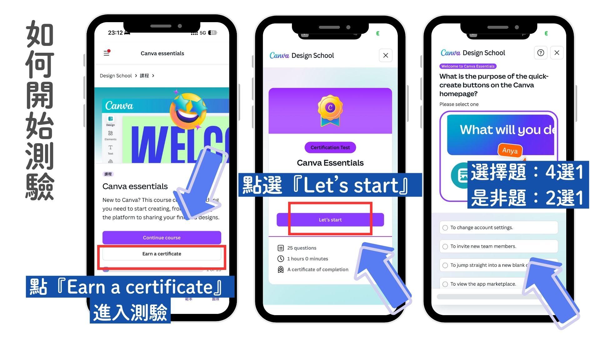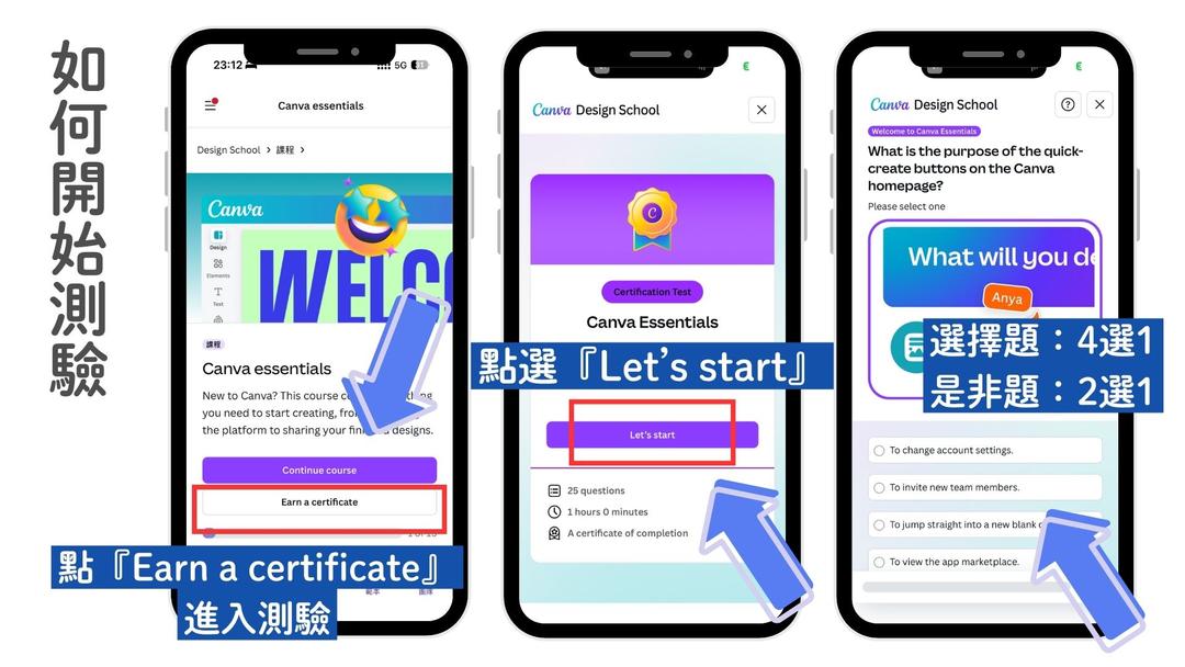 (3)開始學習:每節影片/文章看完,完成課程後按「Let's start」進入測驗。(Canva專業使用者可以跳過學習影片點選『Earn a certificate』直接開始測驗)