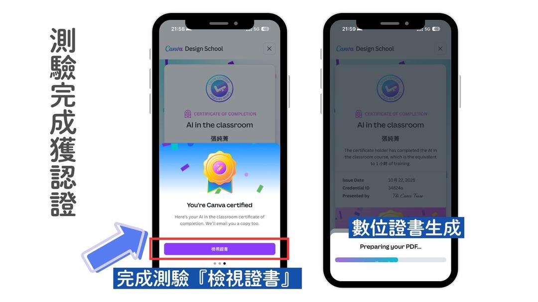 通過流程:看完章節 → 進入測驗 → 達標即頒發數位證書(可下載PDF/加到 LinkedIn)